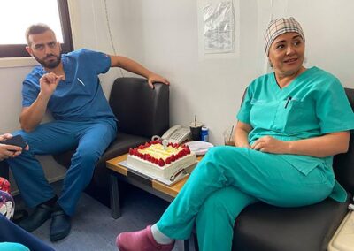 - Την Παρασκευή 28 Αυγούστου είχαν γενέθλια δύο εργαλειοδότες του χειρουργείου του Ιπποκρατείου Νοσοκομείου και στο χώρο των αποδυτηρίων του χειρουργείου έγινε το κόψιμο της τούρτας, τηρώντας φυσικά όλα τα προληπτικά μέτρα λόγω της πανδημίας του κορωνοϊού. Χρόνια πολλά και ευτυχισμένα στην εμπειρότατη και πάντα ευγενική Γκάλια, την οποία γνωρίζουμε σχεδόν 12 χρόνια από τότε που πρωτοξεκινήσαμε να πηγαίνουμε στην Κύπρο, και στον Χριστόδουλο, τον νεαρό αλλά εργατικό και ικανότατο εργαλειοδότη του χειρουργείου.
