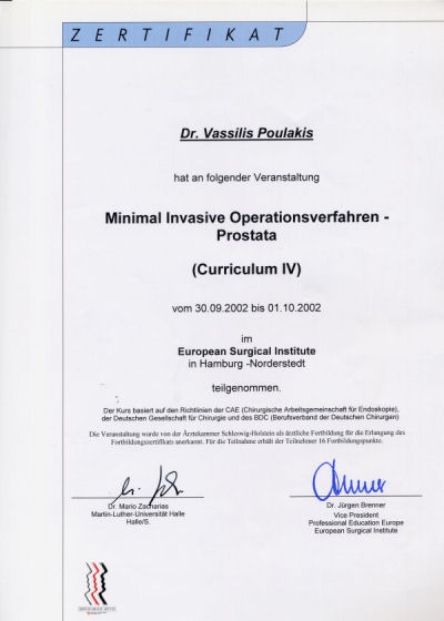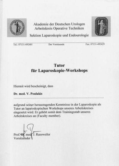 Φρανκφούρτη. Πραγματοποίησε τον Οκτώβριο του 2006 την πρώτη στην Ελλάδα ρομποτική ριζική προστατεκτομή και έχει σήμερα, με βάση τα στατιστικά δεδομένα της εταιρείας, που αντιπροσωπεύει στην Ελλάδα το ρομποτικό σύστημα da Vinci, με μεγάλη διαφορά από τον δεύτερο, την μεγαλύτερη σειρά, σε αριθμό και επιτυχίες, Ρομποτικών Ουρολογικών επεμβάσεων.