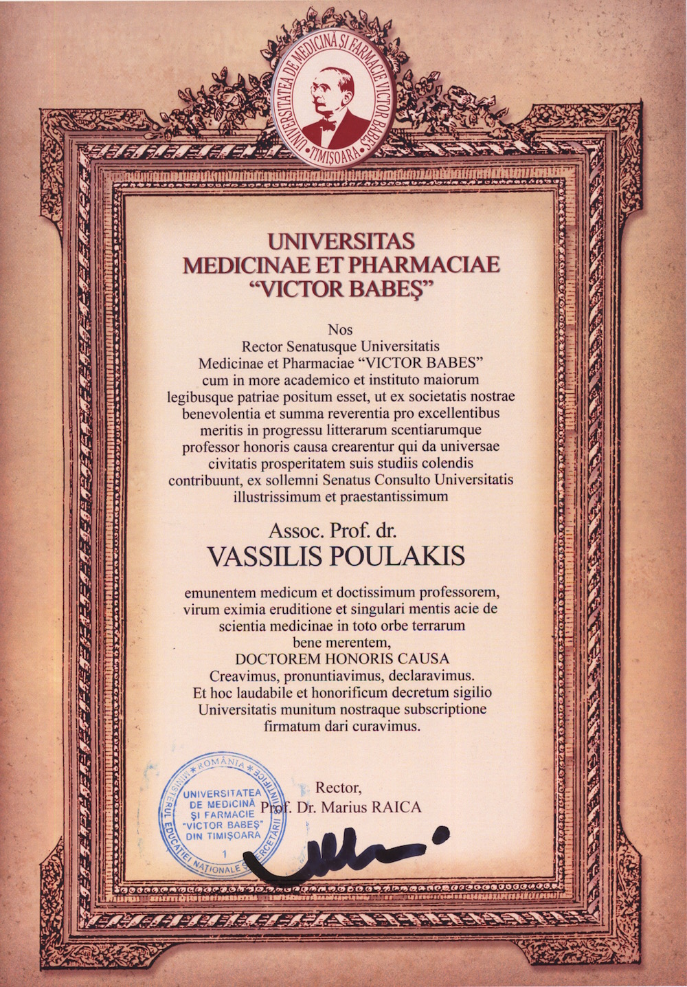 - Απονομή του τίτλου του “Eπίτιμου Διδάκτορα” (Doctor Honoris Causa, Dr. h.c.) από το Πανεπιστήμιο της Τιμισοάρας της Ρουμανίας για την ανεκτίμητη προσφορά του Δρ. Βασίλη Πουλάκη στην ανάπτυξη της τοπικής Ουρολογικής Κλινικής αλλά και στην εδραίωση της ρομποτικής χειρουργικής στην Ιατρική Σχολή του Πανεπιστημίου της Τιμισοάρας (Ιανουάριος 2017).